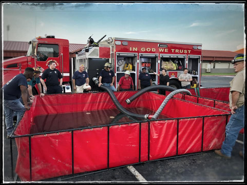 July 28, 2020 Waskom, Elysian Fields, and Nesbitt Fire Departments partnered to conduct dual drop tank training. This training consisted of three tenders (tanker trucks) dropping 6,000 gallons of water into two portable drop tanks which fed an engine that then supplied a 4 inch hose to refill those tenders further down the lot. All total, 10,000 gallons of water was being recirculated between the tenders, tanks, and engine. The purpose of this training was to prepare for a scenario where tenders could be quickly circulated through to dump water into the drop tanks and refill while the next tender unloaded. A second drop tank made it possible to feed the engine from tank A without disruption by having the tenders drop water into tank B, siphoning water from tank B back to tank A allowing for better pump management, and avoiding any issues of sucking air through via a possible vortex created by dumping into the main feed tank. Training was lead by Chief Murf King from Waskom with the assistance of Chief Gary Smith from Nesbitt, and Chief Andy Engdahl from Elysian Fields fire departments.